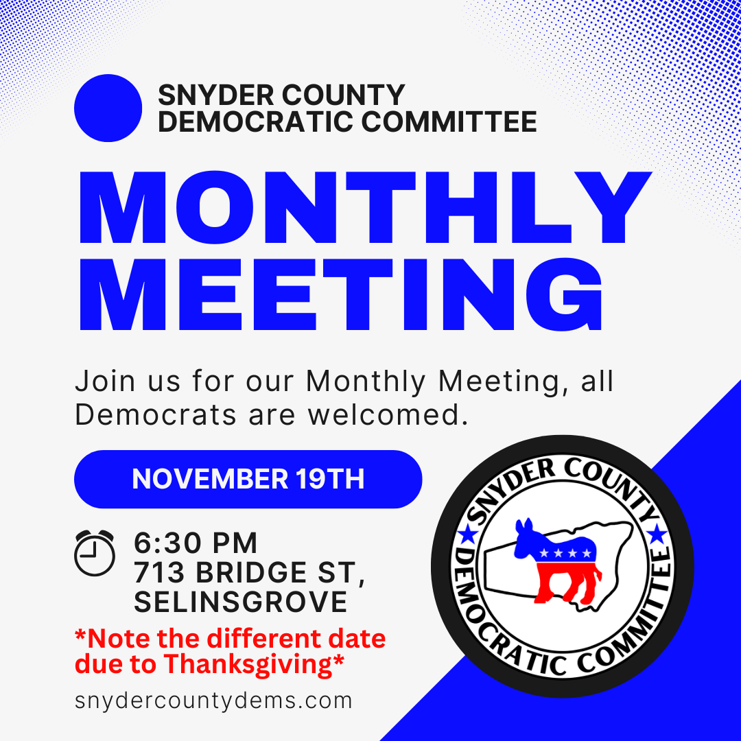 Join us for our monthly meeting! This is the last business meeting until 2026. All Democrats are welcomed. If you are able, please consider bringing a nonperishable food item to ...