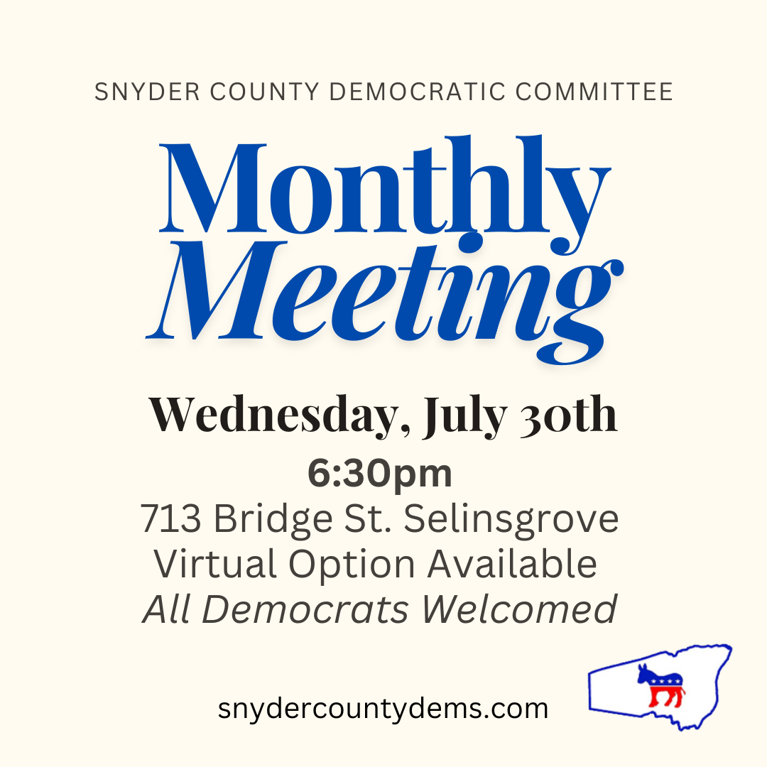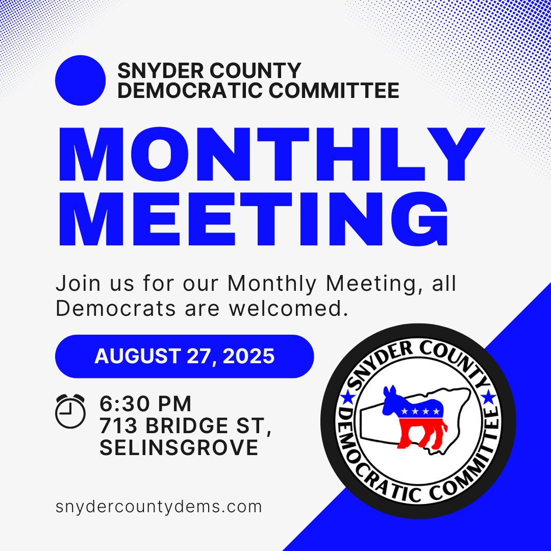 Join us for the Monthly Meeting of the Snyder County Democrats. All Democrats are welcome to join. A virtual join option is available.