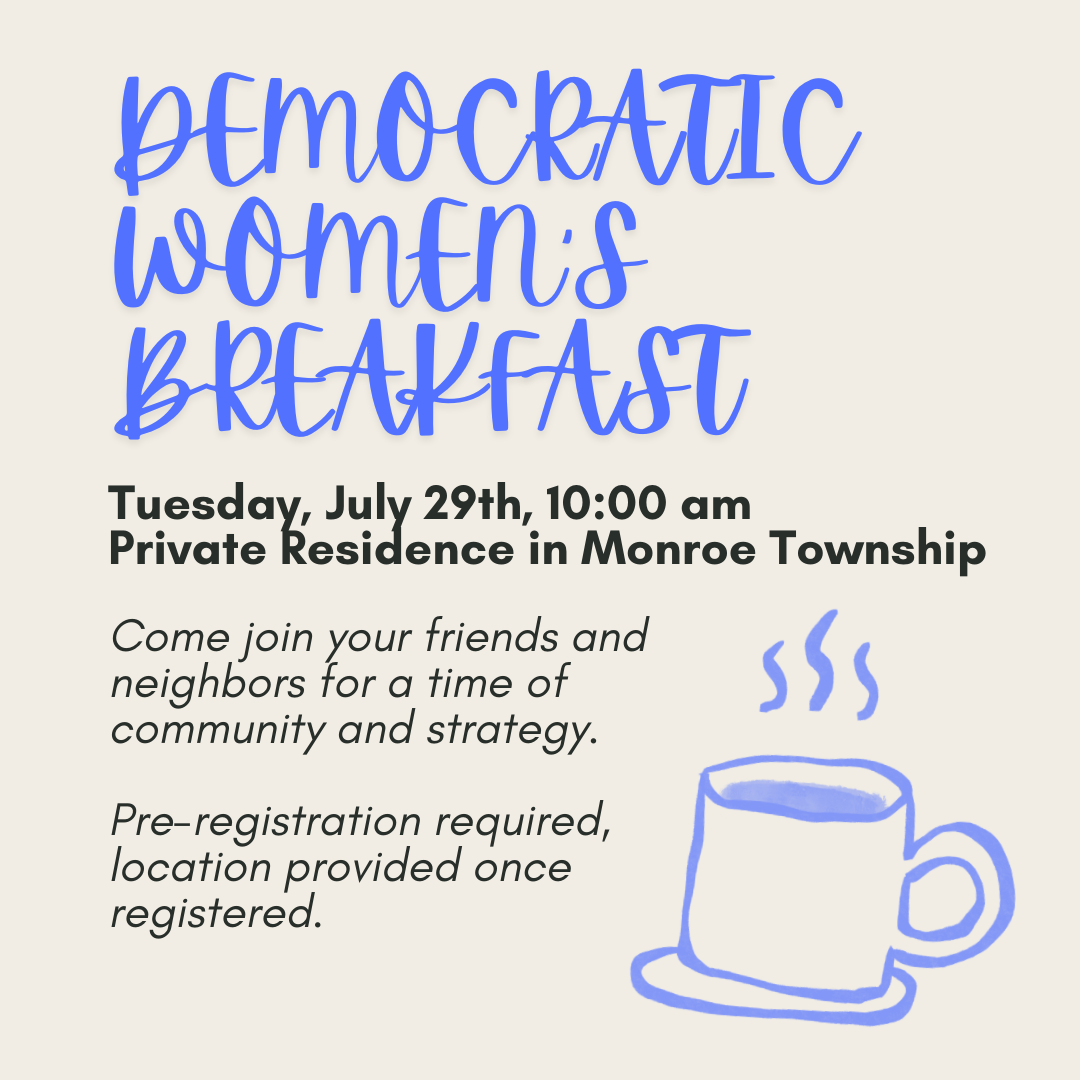 Join our Democratic Women's Groups for their Monthly Breakfast! They will be meeting at the private residence of a member, the address is in Monroe Township and will be shared ...