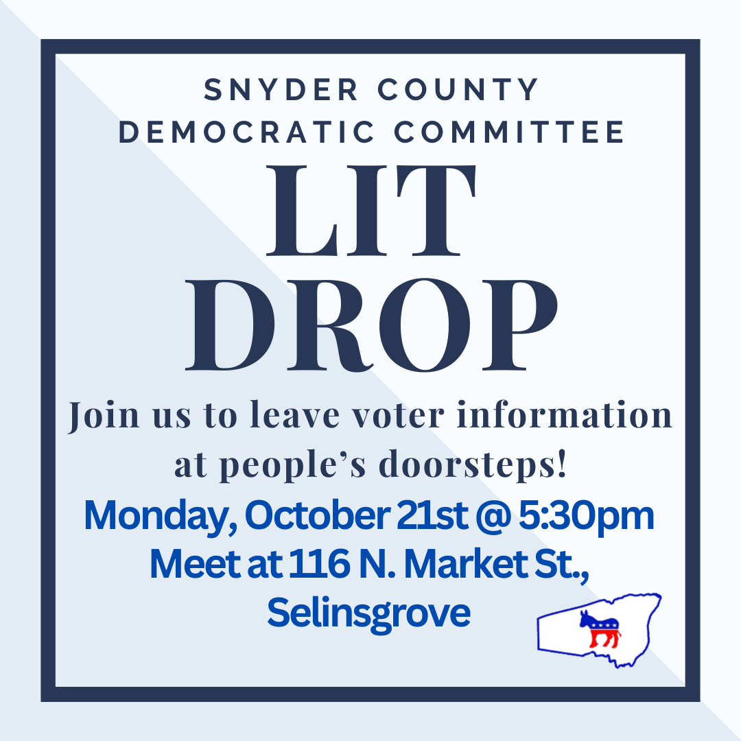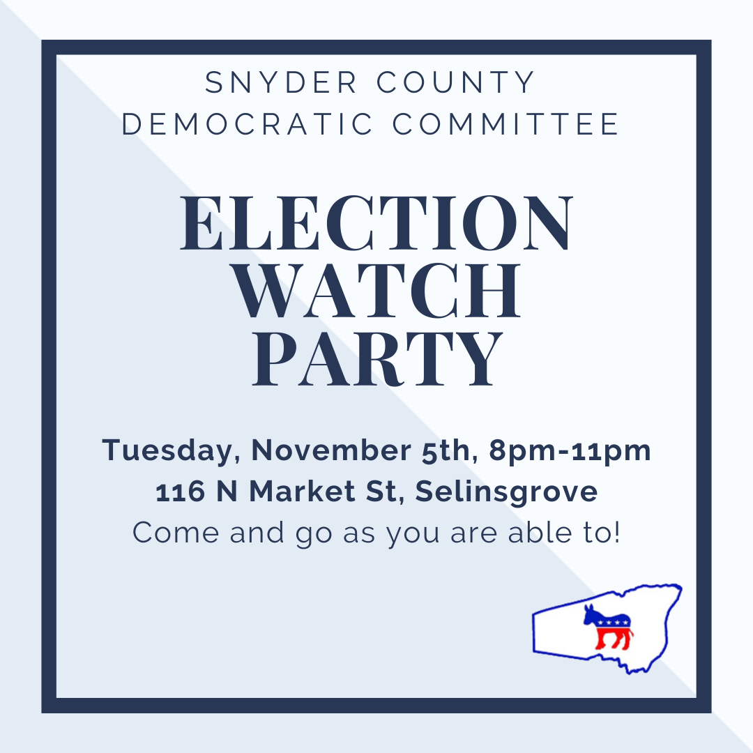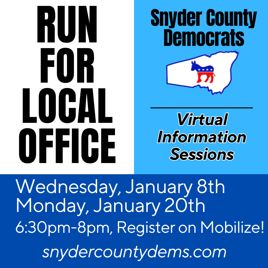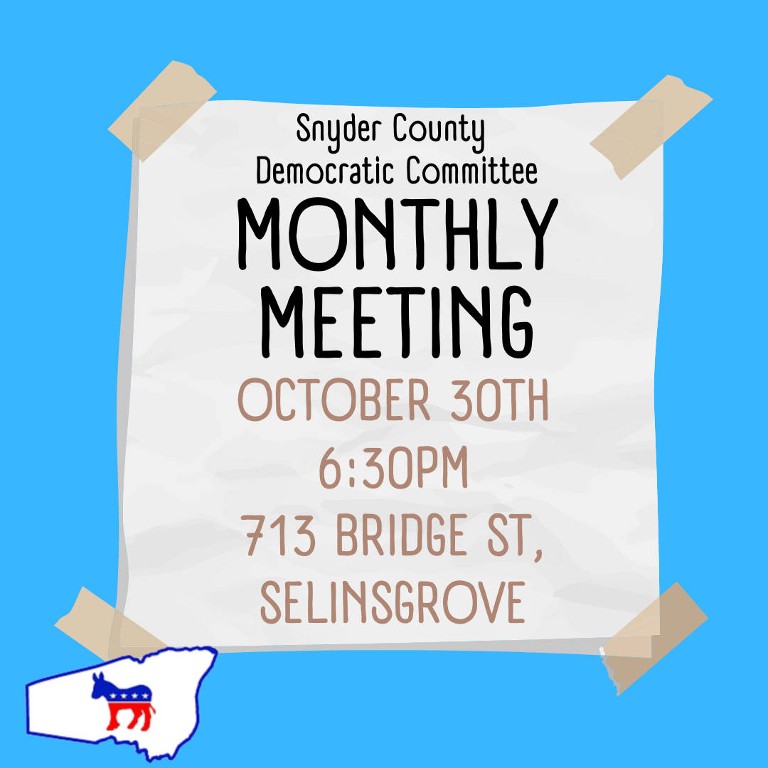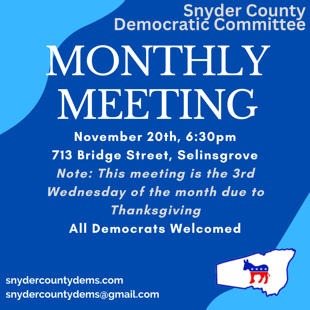 Monthly meeting, all Democrats in Snyder County are welcome to attend. Virtual link available upon request to snydercountydems@gmail.com