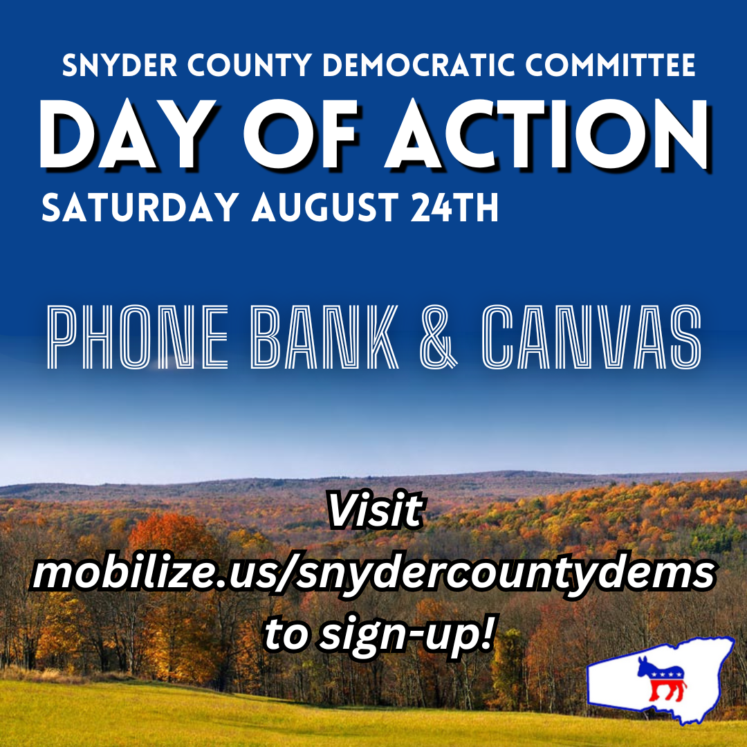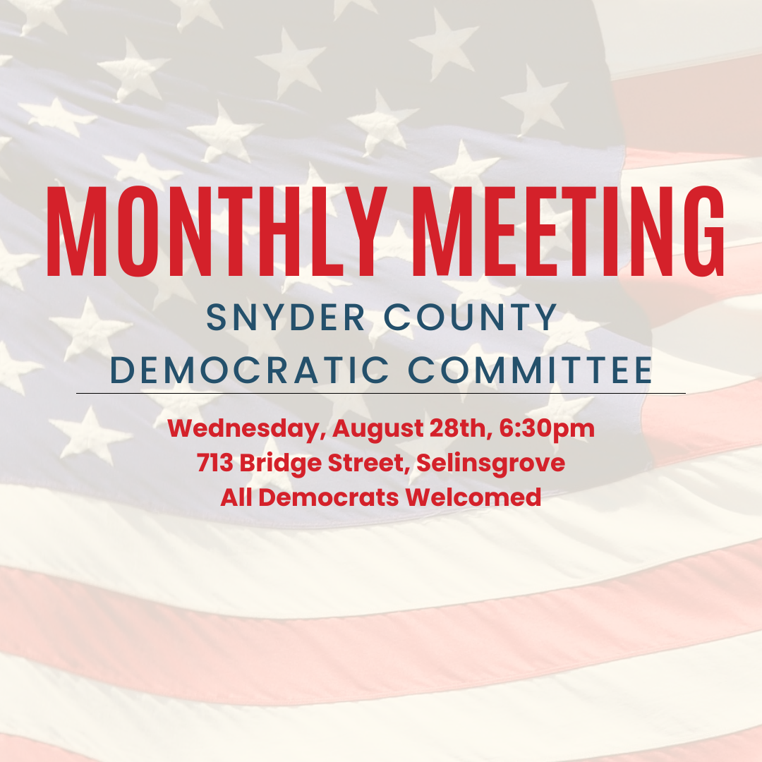 Monthly meeting, all Democrats in Snyder County are welcome to attend. Virtual link available upon request to snydercountydems@gmail.com