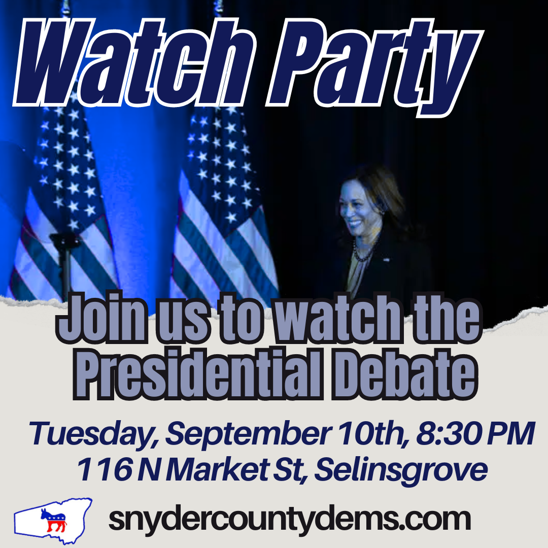Join us to watch Presidential Candidate Kamala Harris debate Former Vice President Donald Trump on Tuesday, September 10th. This event starts at 8:30PM and is at our Office.