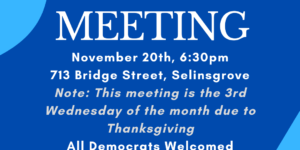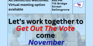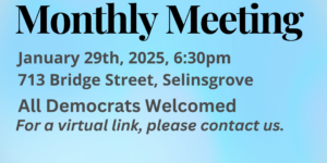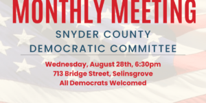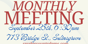 Monthly meeting, all Democrats in Snyder County are welcome to attend. Virtual link available upon request to snydercountydems@gmail.com